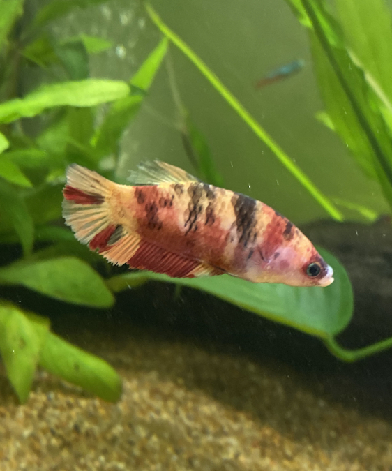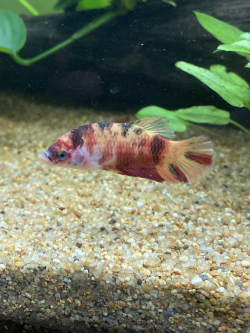 Jeune femelle betta aux motifs Koï qui a besoin d'un aquarium avec plus d'espace. Elle est en très bonne santé et ne s'est jamais montrée agressive envers aucune espece.