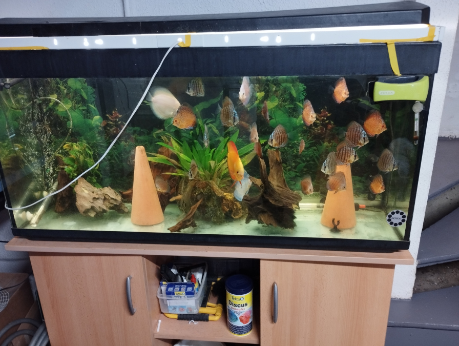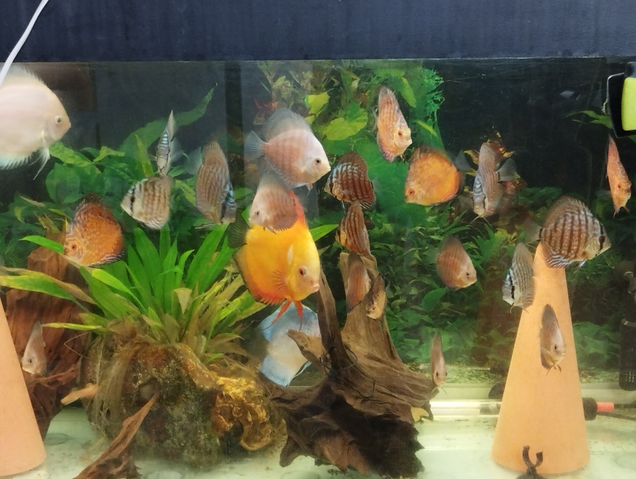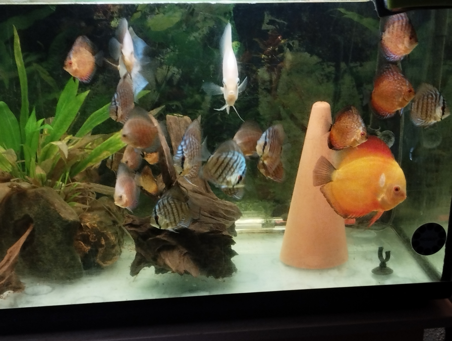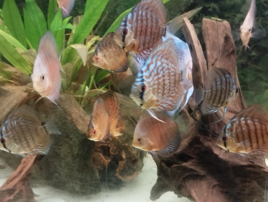 Jeunes discus nés chez moi taille 5 et 6 cm eau 400 microsiemens. Mangent Tétra Discus granulés, cœur de bœuf mélangé à de la spiruline par mes soins. 20€ pièce ou par cinq 75€. A retirer à mon domicile.