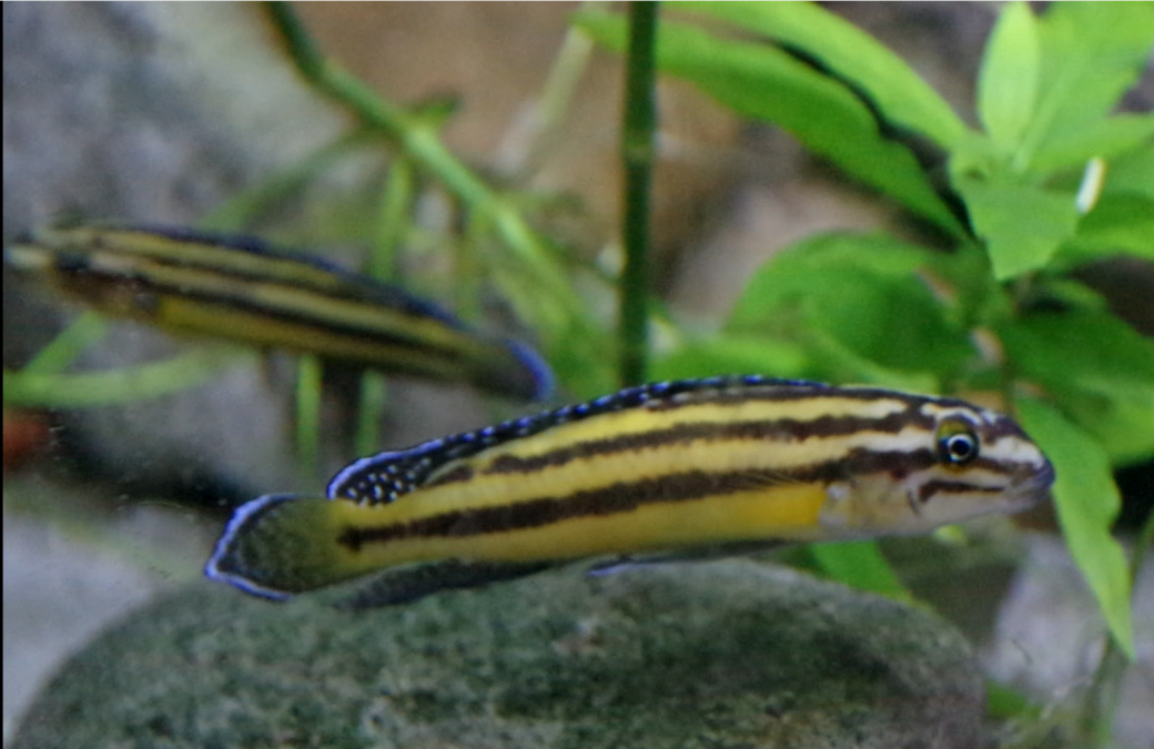 Des jeunes Julidochromis nés chez moi. Je ne sais pas combien il peut y en avoir dans le bac car ils se cachent bien (ils se méfient de l'Altolamprologus qui leur sert de nounou...). Il y en a certainement assez pour avoir un couple !