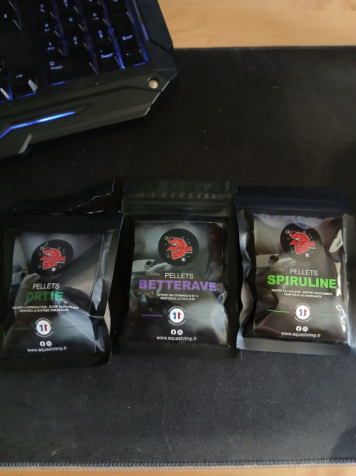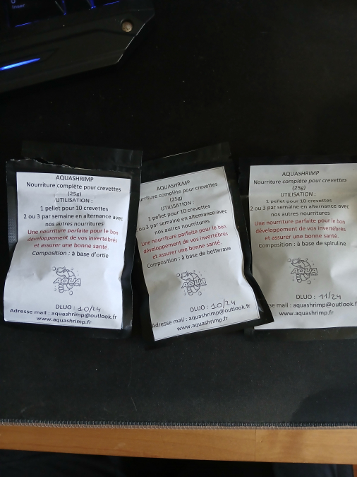 Ayant arrêté mon aquarium à crevette. Je vend la nourriture qu'il me restait. Seul un des 3 sachets est ouvert mais très peu entamé.