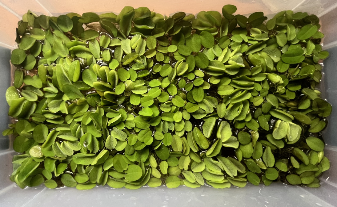 Surplus de salvinia natans, parfait pour tamiser la lumière de votre aquarium, pomper les nitrates et offrir des cachettes à vos petits habitants ! (le tout recouvre la surface d’un aquarium de 60 litres environ)