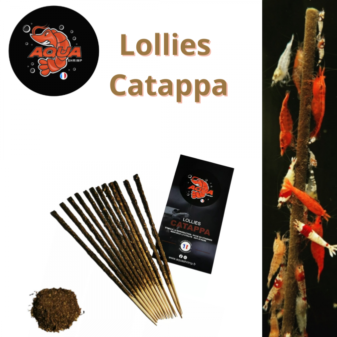 Alimentation riche en protéines et en vitamines. La catappa: L'allié vitalité. Naturellement riche en vitamine A,B et C, la catappa est également fortement chargée en tanins , très appréciée des crevettes. Les lollies aquashrimp reprennent la version enrichis des feuilles de catappa. En plus d'être une nourriture, la catappa améliore la reproduction et renforce le système immunitaire, anti stress, couleurs plus vive des crevettes,réduit le PH, anti bactérien. Produit 100% naturel Lot de 12 lollies de 15 cm Les lollies aquashrimp sont fabriquées artisanalement en France, avec des produits bio.