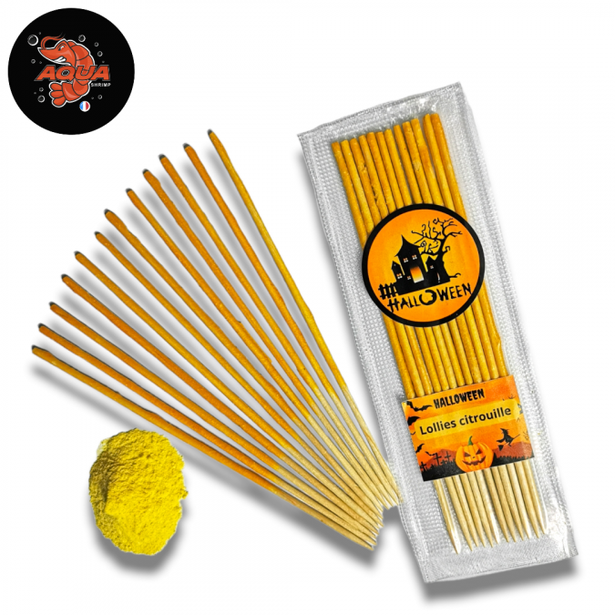 Viens collectionner les autocollants halloween ! en achetant les lollies citrouille, tu gagnes un autocollant Halloween ! LOT DE 12 LOLLIES CITROUILLE BIO Alimentation riche en protéines et en vitamines. La citrouille renforce la couleur grâce aux carotenoides qu'elle contient. En plus des carotènes, la citrouille est riche en vitamines naturelles A, B1, B2, B6, C, E, en acide folique, en fer, magnésium et aide à la reproduction des invertébrés. Produit 100% naturel Lot de 12 lollies de 15 cm Les lollies aquashrimp sont fabriquées artisanalement en France, avec des produits bio.