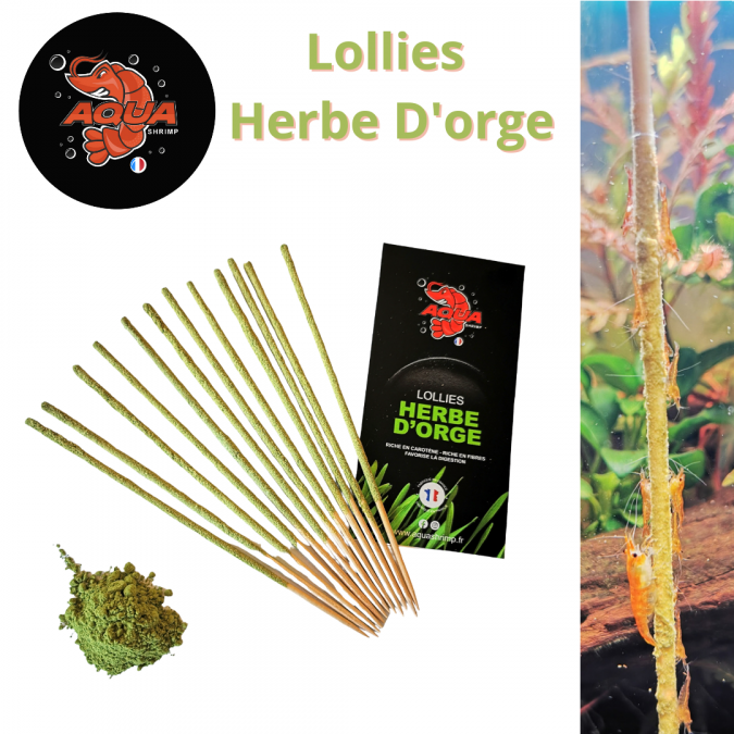 Alimentation riche en protéines et en vitamines. 12 lollies herbe d'orge bio. L'herbe d'orge est un véritable élément incontournable pour nos crevettes. En plus d'innombrables minéraux, l'orge contient des éléments utiles, tels que des vitamines, de la chlorophylle, des bioflavonoïdes (substances provenant des plantes), des fibres et des antioxydants. Les lollies herbe d'orge aide également la digestion des crevettes. Les vitamines A, C, E et K assure vitalité et santé de vos invertébrés. Les lollies aquashrimp sont fabriquées artisanalement en France avec des produits bio.