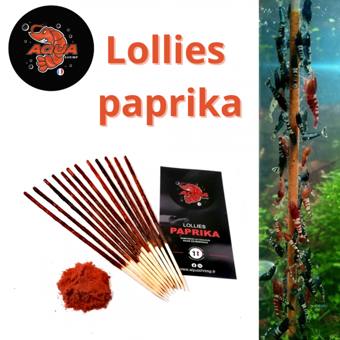 LOT DE 12 LOLLIES PAPRIKA Alimentation riche en protéines et en vitamines. Le paprika renforce la couleur grâce aux carotenoides qu'il contient. Il est égalemment riche en vitamines K, vitamine E et B2. Produit 100% naturel Lot de 12 lollies de 15 cm pour 4,99 euros Les lollies aquashrimp sont fabriquées artisanalement en France, avec des produits bio.