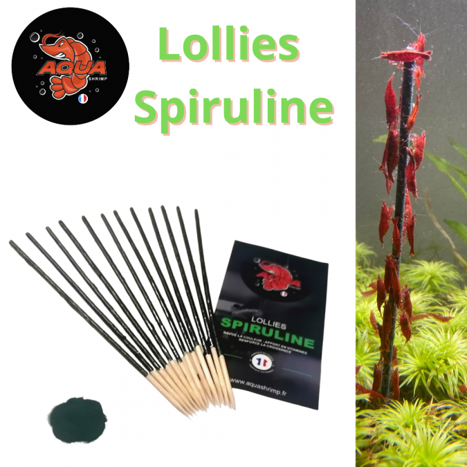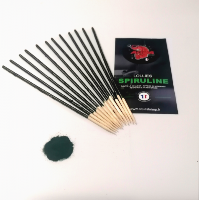 LOT DE 12 LOLLIES SPIRULINE Alimentation riche en protéines et en vitamines. La spiruline : Le super-aliment par excellence. Veritable concentré de nutriments, la spiruline améliore la croissance, la digestion et renforce le système immunitaire. La béta-carotène qu'elle contient renforce les couleurs des crevettes. Produit 100 % naturel Lot de 12 lollies de 15 cm pour 4,99 euros Pour éviter certaines carences alimentaires vous pouvez alterner avec nos pellets et autres nourritures. Les lollies aquashrimp sont fabriquées artisanalement en France, avec des produits bio.