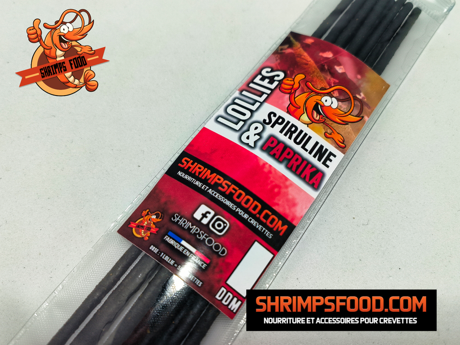 10 Lollies Spiruline et Paprika Produit fabriqué en France (Dinan-Bretagne) Les lollies sont une vraie friandise pour nos crevettes. C'est un bâton en bois recouvert de nourriture qui se pique dans votre sol d'aquarium. Un aspect ludique et intéressant pour observer vos plus belles espèces. Enlevez le bâton une fois consommé Taille : 25cm ingrédients : Oeufs + Spiruline & Paprika Les lollies pour crevettes par Shrimpsfood