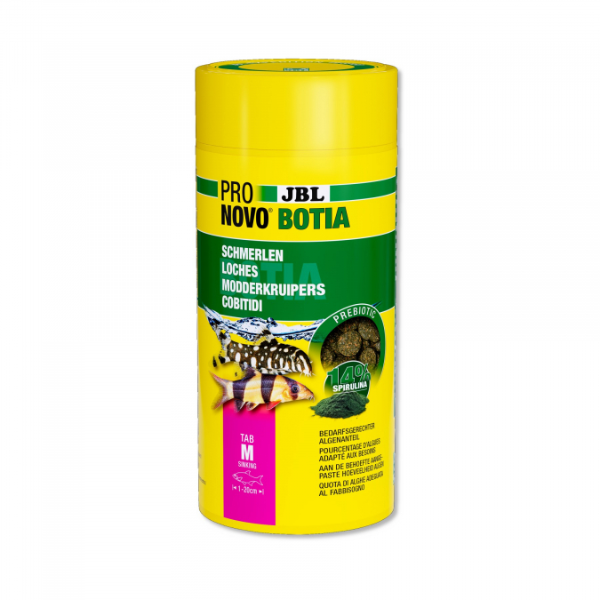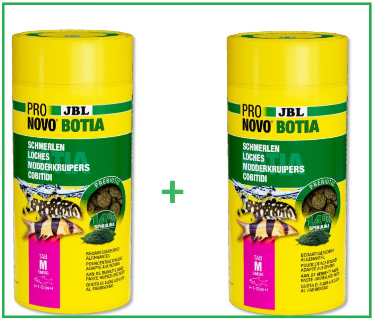 LOT 2 JBL ProNovo Botia Tab M 100ml ALIMENT POISSON D ORNEMENT LOCHE Alimentation équilibrée et croissance optimale des poissons d'eau douce herbivores et des crevettes. Conditions de nutrition idéales pour les espèces de poissons de 3 à 20 cm, vivant à toutes profondeurs. Conservation : 4 mois après ouverture, 3 ans dans l'emballage haut de gamme avec film de scellage fermé. 160g. Aliment de base idéal pour tous les Cobitidés (Botia, Gyrino, Gastromyzon, Pangio) Utilisation : laisser couler au fond de l'aquarium ou fixer sur la vitre intérieure par une légère pression. Ingrédients bruts, sans additifs synthétiques, pour une alimentation naturelle et des loches en bonne santé. Grande appétence, même pour espèces difficiles, grâce à des ingrédients haut de gamme, saumon, spiruline et crevettes. Contenu : boîte scellée, étanche à l'air et à la lumière, recyclable, doseur dans le couvercle (pour 100,250,1 l) Avantages : Aliment de base idéal pour tous les Cobitidés (Botia, Gyrino, Gastromyzon, Pangio) Composition : Spiruline: 14.00; Farine de saumon: 12.00; Germes de blé: 8.00; Farine de soja: 7.00; Farine de riz: 7.00; Farine de crevettes: 7.00; Farine d'herbes: 6.00; Farine de blé: 6.00; fibres de pomme: 5.00; Gluten de blé: 4.00; Farine de krill: 3.00; Epinards: 2.00; flocons de pomme de terre: 2.00; Extrait de levure: 2.00; Semoule de maïs: 2.00 Conservation : Vitamines par kg - Vitamine C: 200 mg; Vitamines par kg - Vitamine E: 300 mg; Vitamines par kg - Vitamine D%u2083: 3000 I. E.; Vitamines par kg - Vitamine A: 25000 I. E.; Colorants - ne sont pas ajoutés par JBL: ; Antioxydant - E 306: Conseil d'utilisation : Donner une à deux fois par jour autant de nourriture que les animaux en ingèrent en quelques minutes.