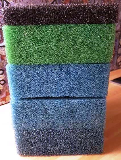 Lot de 5 mousses de différentes densités + 2 paniers VIDES à remplir avec les médias biologiques de votre choix (nouilles, céramiques, billes de tourbe, zéolite, charbon actif...)