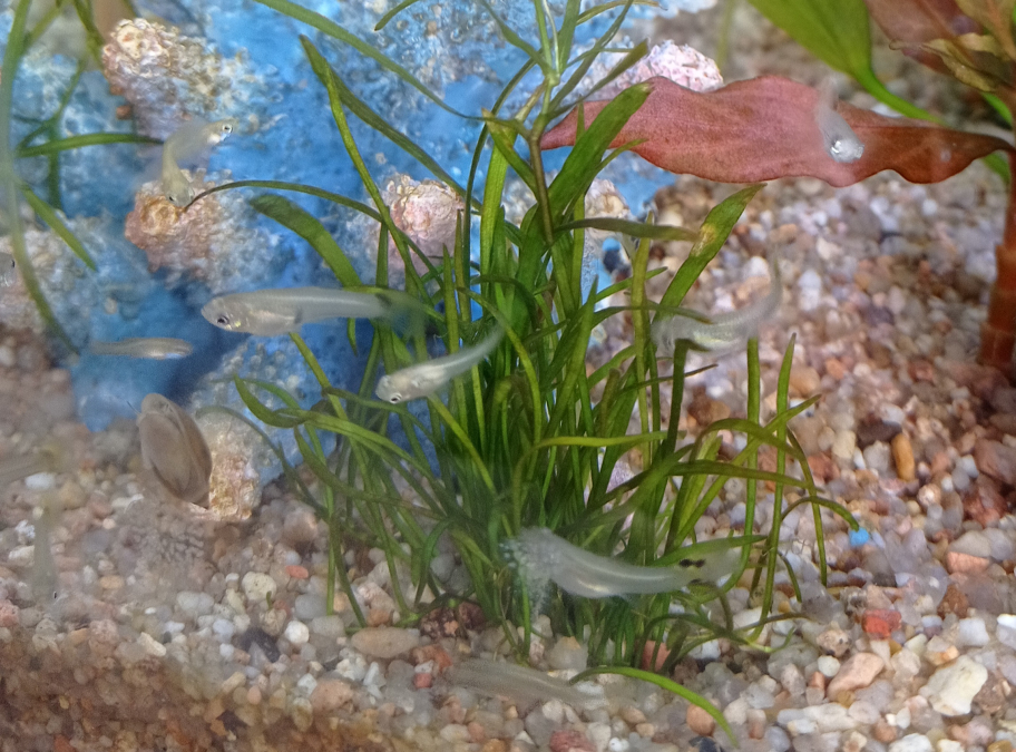Alevins Guppys vendus en lot de 10 minimum : 2€ Nés en avril et mai. Non sexables pour le moment et les couleurs commencent à apparaître. Les parents sont des cobras rouge, vert et bleu