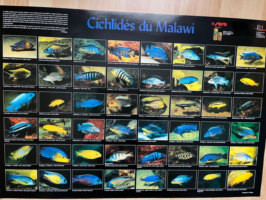 Vends un magnifique poster avec de très belles photos de Cichlidés du lac Malawi. Papier glacé brillant. Poster neuf non plié ni troué, pas de trace de scotch. Conservé à plat. Dimensions : 78cm X 53cm Envoi possible dans un emballage soigné. Plusieurs exemplaires dispo