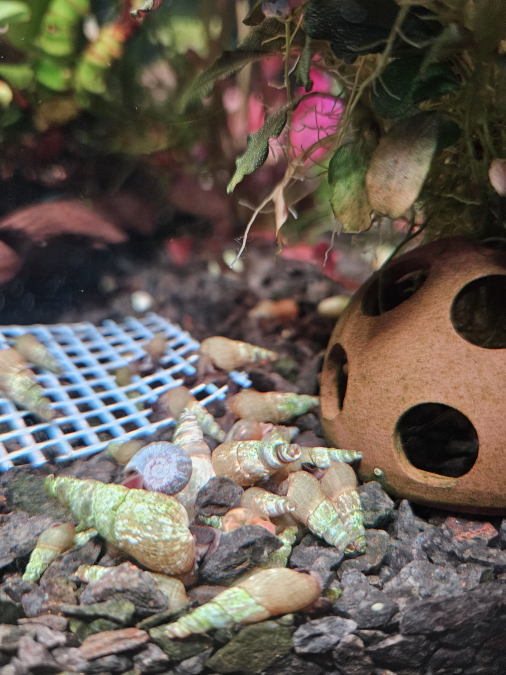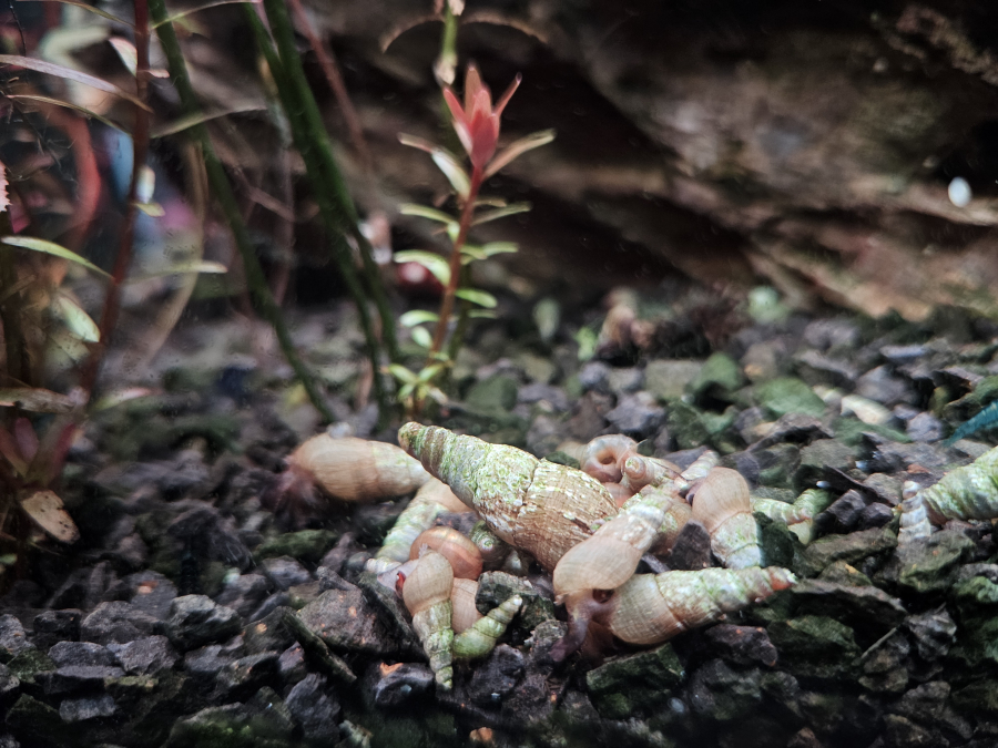 Lot de 10 escargots 4 euros Très bon allié contre les algues, et escargot ne touchera jamais aux plantes en bonne santé. C’est un mollusque détritivore, alguivore et carnivore. Ainsi, il se nourrira des restes d’aliments, de cadavres, d’algues, de plantes abîmées ou en décomposition. Le Mélanoïde est un escargot à l’activité nocturne. Dans la journée, il s’enfouit dans le sable ce qui est très bon : il le fertilise et l’aère. Cela permet également une bonne circulation des substances nutritives dans le sol, ce qui est bénéfique aux plantes. Très bon indicateur de l’état de votre aquarium : si vous nourrissez trop votre population, la multiplication des Mélanoïdes sera fulgurante ! Si vous avez un pic de nitrites ou un manque d’oxygène, ils remonteront tous à la surface.