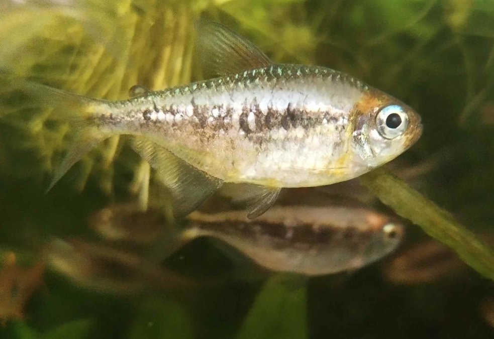 Le Moenkhausia nigromarginata est un tétra rosé d'environ 5 cm de long, originaire du Brésil, caractérisé par ses yeux bleu aquatique et ses écailles brillantes en forme de diamant. Ce sont adultes issus de ma reproduction à venir chercher sur Athis-Mons