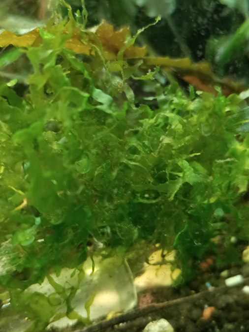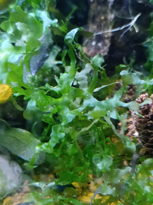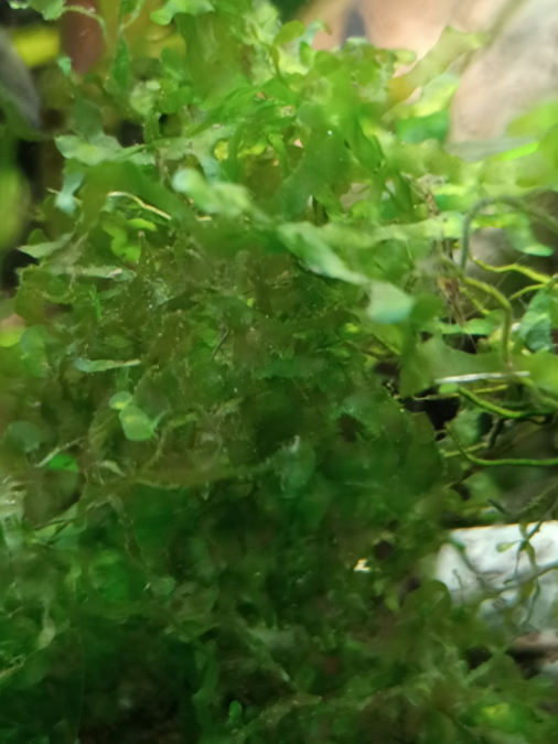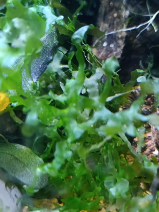Refuge idéal pour les crevettes, les coussins de monosolenium tenerum se développent au fond de l'aquarium.