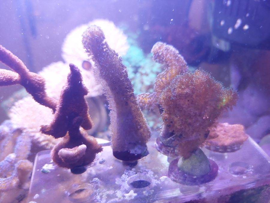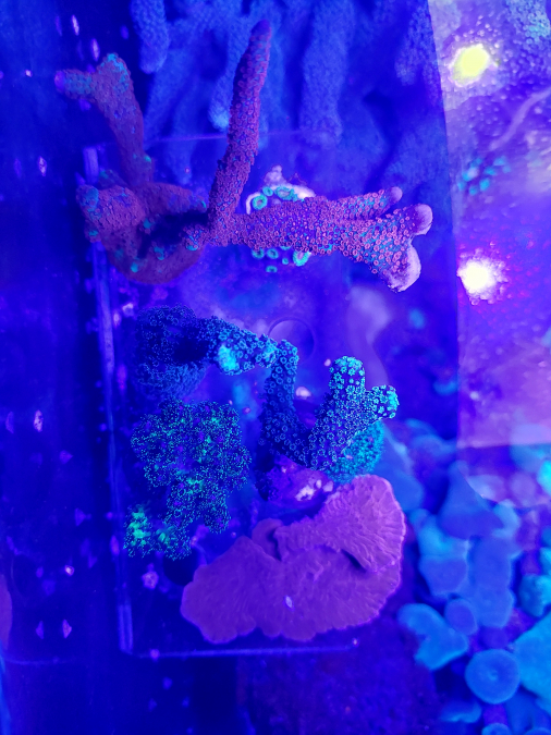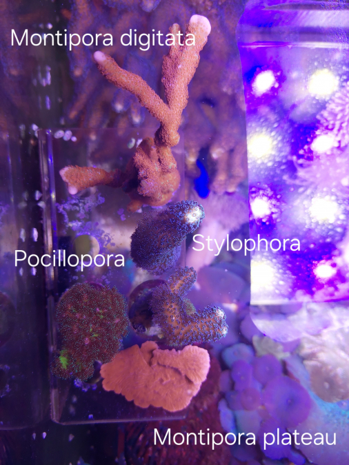 Vends boutures SPS 10€ chacune sur plot : 1 montipora plateau rouge 1 montipora digitata rouge 1 Pocillopora damicornis vert 2 Stylophora milka (bleu)