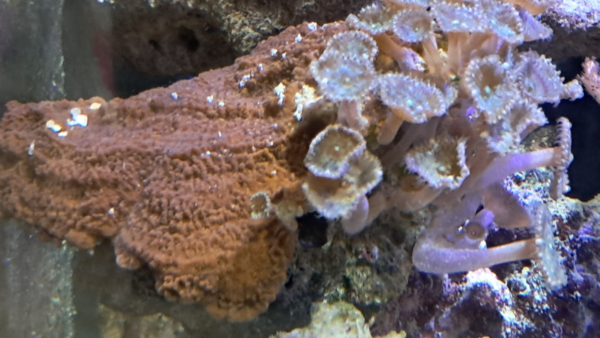 montipora rouge avec palythoa vert sur pierre vivante 10 cm