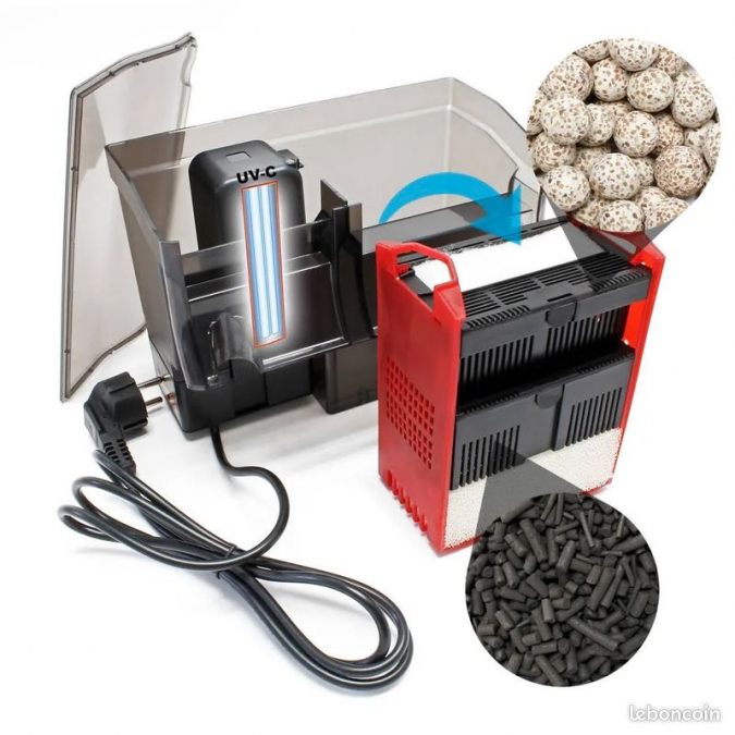 [Hang on filter CGB-800] – Le filtre suspendu offre une filtration optimale pour aquariums de 75 à 190 litres, avec une capacité de pompe de 800 l/h et une consommation énergétique de seulement 5 W. • Capacité de pompe 800 l/h, avec UVC 5 W • Tissu filtrant, charbon actif, boules bio • Débit d’eau réglable, écumeur inclus • Pour aquarium de taille 75–190 litres