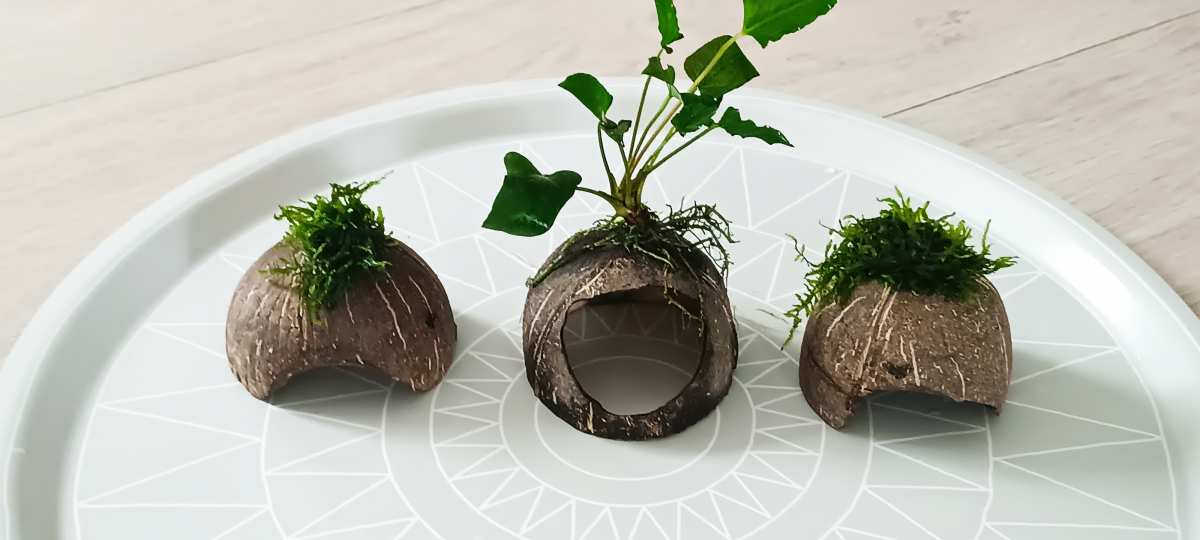 Noix percées avec de la mousse de java ou anubia. 10€ pièce.