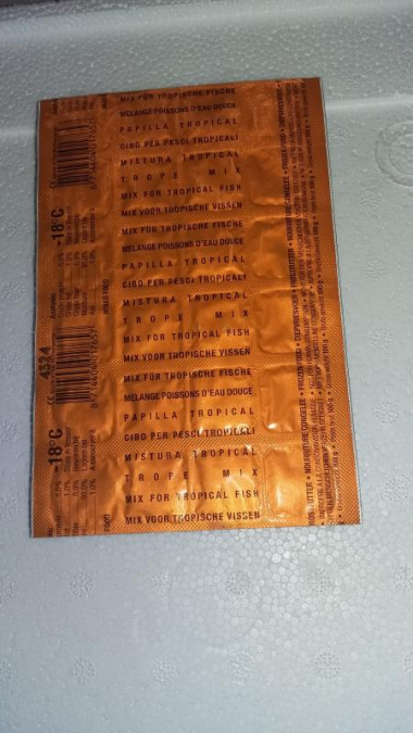La nourriture tropicale est congelée, conditionnée au sein d'un blister de 100 grammes répartis en 24 compartiments. Recette secrète et déposée, elle est constituée d'un mix d'aliments particulièrement appréciés des poissons tropicaux d'eau douce.
