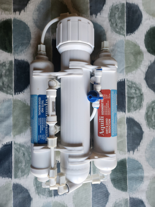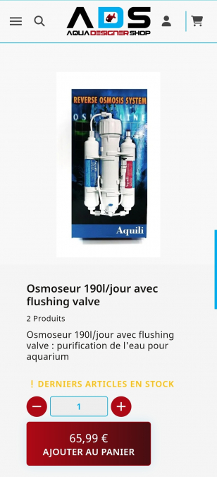 Osmoseur Aquili 190L/J acheté chez Aquadesigner il y a 1 an et demi. L'eau ressort encore très faible en us donc pas forcément besoin de changer les cartouches tout de suite. Par contre, rapport de 3:1 donc beaucoup d'eau de rejet. Convient pour un besoin pas trop important et que vous ne voulez pas investir dans un osmoseur professionnel. A venir chercher ou envoi possible.