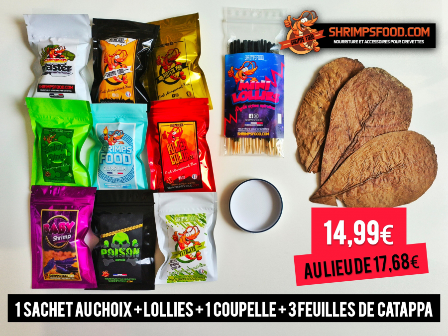 Découvrez la gamme Shrimpsfood de nourriture pour crevettes avec le pack complet. Le nouveau Pack complet nourriture pour crevettes est enfin la ! Economisez en achetant ce pack 1 sachet de stick pour crevettes au choix : Shrimps Dingo, Minéral +, Power Color, Vitality, Olympicus, Baby Shrimp, SHRIMP master, Poison, Protein Max, Sachet de 25 à 30Gr selon la recette 1 sachet de 20 Mini lollies pour crevettes (15cm) : Brocoli orties Spiruline - pour 20-30 crevettes environ 1 coupelle de nourrissage pour crevette - modèle aléatoire 3 feuilles de catappa Shrimpsfood Nourriture pour crevettes