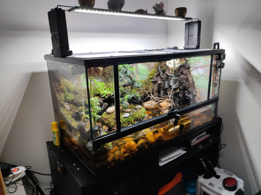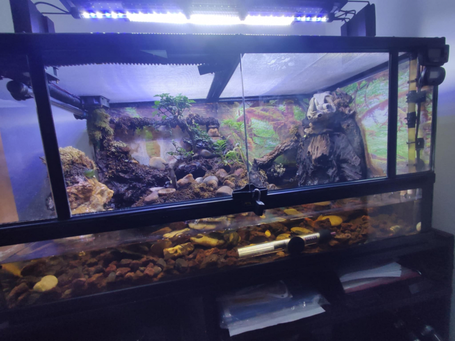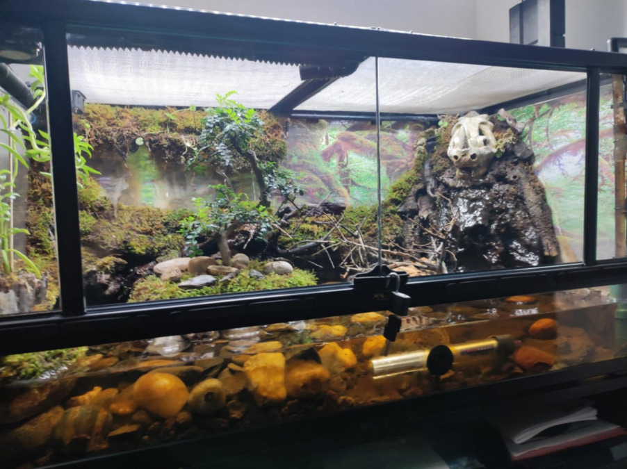 Bonjour vends paludarium de Longueur 1 m / largeur 44 , avec deux portes vitrées , avec grille sur le dessus, plus crabe vampire et guppy, plus déco, plus pompe de relevage 1400 l / h Contacter au numéro 06/29/95/34/22