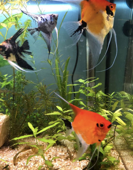 À vendre 5 scalaires 10€ le poisson 1 gris 2 noir 2 orange