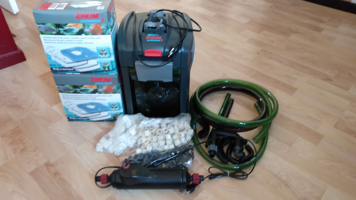Pompe filtrante EHEIM 2071 Professionnel 3 pour volume de 250 à 300L. La cuve 4L renferme au total 2 paniers de filtration. Débit maximale de 950L/h pour hauteur de refoulement d'1,50m et une consommation de seulement 12W. Tuyaux 16/22mm. Vendu avec système HYDOR chauffage externe aquarium ETH 300 Watts, également 2 cartons de mousses filtrante valeur 28 € et ustensiles présents sur photos.