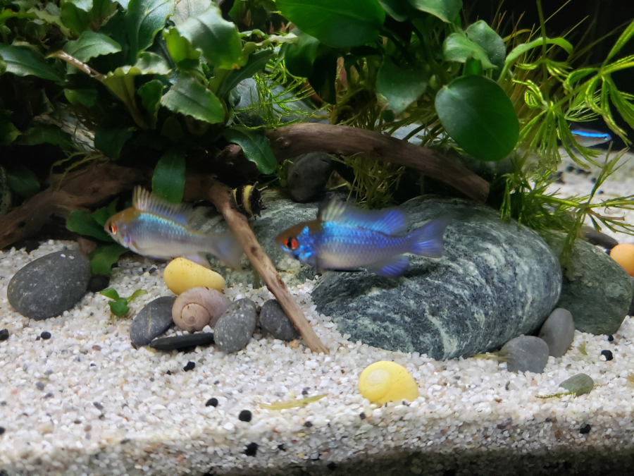 Vends lot de 6 poissons: 2 Ramirezi bleu electrique 1 mâle (certain) 1 femelle (acheté en boutique sous ce genre mais incertitude) 4 Rasbora Espei