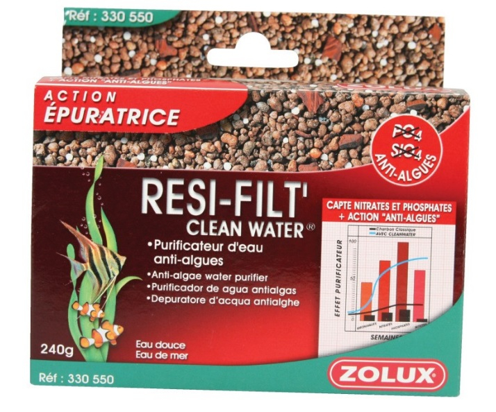 RESIFILT'CLEANWATER PURIFICATEUR D'EAU ET ANTI-ALGUES Resifilt'cleanwater Zolux 240 g pour 60 à 100l d'eauaquarium Purificateur d'eau pour aquarium, avec action "anti-algues" renforcée. Masse filtrante pour eau douce et eau de mer.