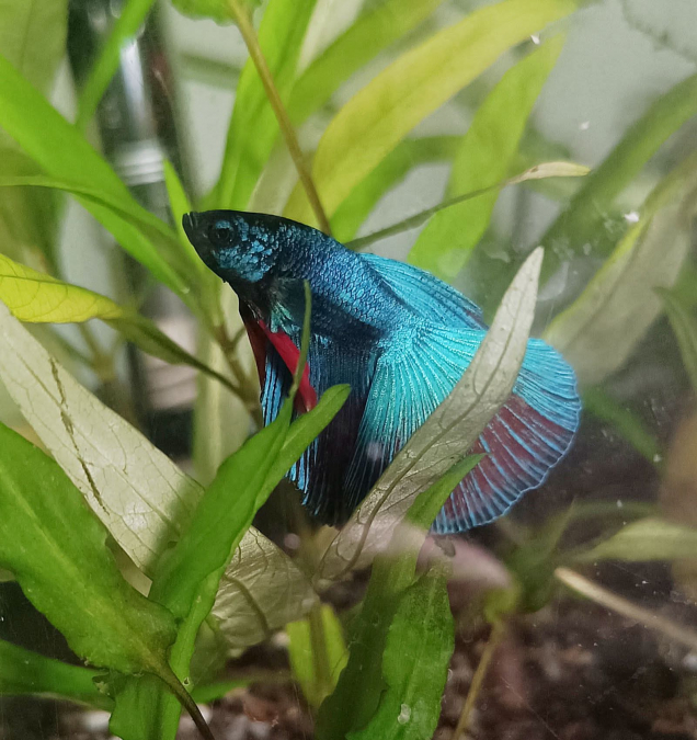 Mâle issu d'un père bleu marbré et d'une mère red fancy. Né en France le 20 juin 2025, forme de voiles super delta. Caractère assez craintif, aime passer du temps dans ses cachettes. Mange de tout (granules/vivant/congelé) Pas d'envoi. Me contacter en privé