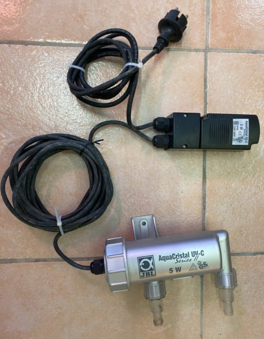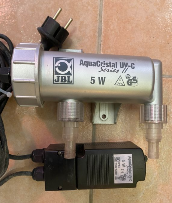 Stérilisateur UV Aquacristal JBL 5W état impeccable lampe UV bonne Idéal pour une eau d'aquarium ou de petit bassin limpide et claire, l'élimination des particules et de l'eau verte. Pour aquarium de 50 à 300 litres Envoi possible.