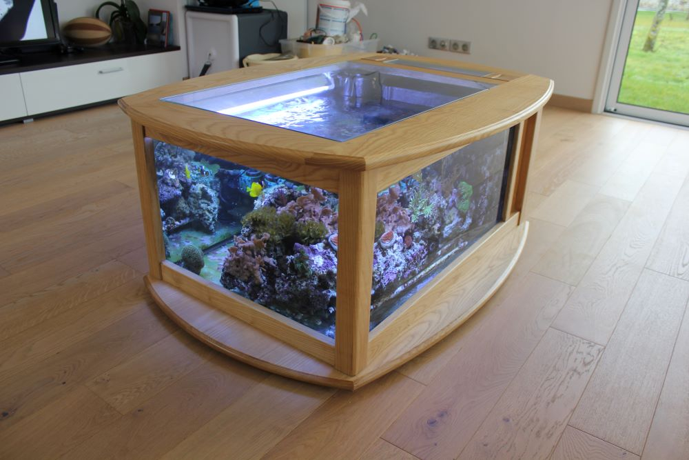 Table basse aquarium artisanale Modèle unique en Frêne massif vernis mat (vernis refait à neuf) - Capacité bac 200 Litres - Partie technique avec porte d'accès verrouillable - Eclairage intégré avec 2 néons T8 JBL Natur solar neufs 18W branchés sur alimentation avec starters - Filtre ajouté dans la cuve, modèle BLUEWAVE07 avec pompe Maxijet 200L/h, chauffage 300W, ouate, bioball et céramique - Le dessus s'enlève pour accès au bac, soit juste le petit verre triangulaire pour nourrissage, soit la grande plaque en verre, ou l'intégralité du couvercle en bois. - Possibilité soit d'avoir un petit bac technique en partie haute, soit le système de ventilation (fourni avec son alimentation) qui évite toute trace de buée sur la vitre supérieure. Le bac a été en eau douce puis en eau de mer mais peut être utilisé en eau douce froide ou chaude Bac original et bien conçu qui fait son effet L'aquarium complet est livré en plus avec quelques accessoires: - 2 pompes RENA FILSTAR interne - 1 petite pompe MICRA 400L/h - 1 pondoir JBL BabyHome - Petite et grande épuisette - Kit nettoyage Le matériel "eau de mer" a été vendu séparement A récupérer sur Vix (85) ou possibilité de livraison avec coût supplémentaire selon lieu, à voir ensemble.