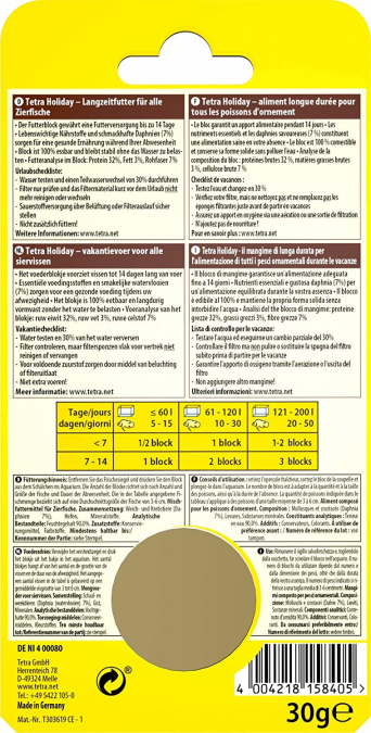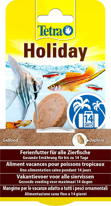 TETRA HOLIDAY ALIMENT VACANCES POUR POISSONS TROPICAUX Contenu du packaging: 1 bloc de 30 g Aliment complet en bloc gélifié spécialement conçu pour nourrir jusqu'à 14 jours tous les poissons tropicaux. Aliment submersible qui coule au fond de l'aquarium 1 bloc gélifié de 30g pour une meilleure conservation des composants Une alimentation saine jusqu'à 14 jours d'absence Composé de Daphnies naturelles, vitamines et oligo-éléments essentiels, acides aminés et minéraux Ne pollue pas et ne trouble pas l'eau. Ne modifie pas les paramètres de l'eau .Facile à doser PRODUIT NEUF .JAMAIS UTILISE NI DEBALLE