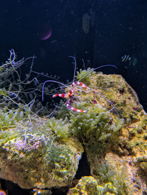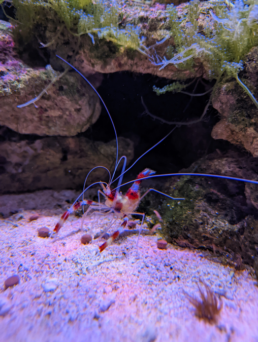 Un couple de grande crevettes nettoyeuses à échanger contre des poissons mangeurs d'algues Nom scientifique: Stenopus hispidus (crevette à bandes rouges et blanches)