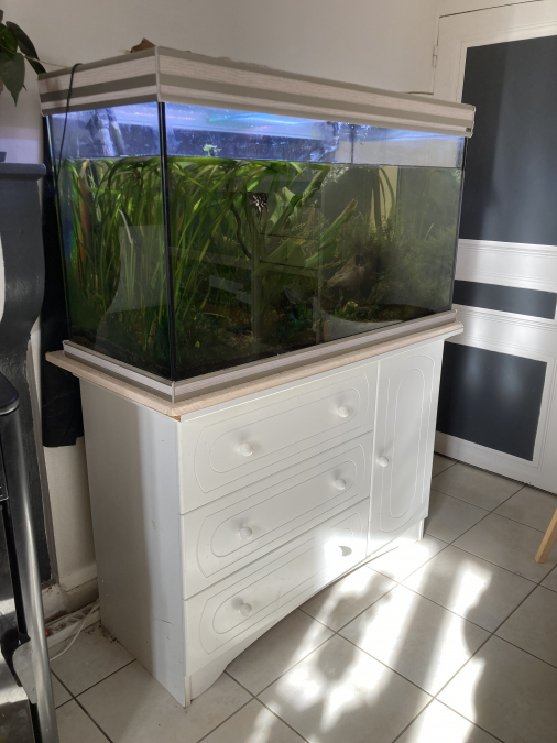 Vends Grand aquarium aquatlantis complet 400l état neuf, pas une rayure! En eau 1 an. Avec tous ses accessoires : - pompe externe techatlantis cleansys pro 1400 -2 néons led ( un pour les plantes et l’autre les poissons) - chauffage - substrat et sable - meuble qui permet d’y ranger la pompes et divers accessoires.