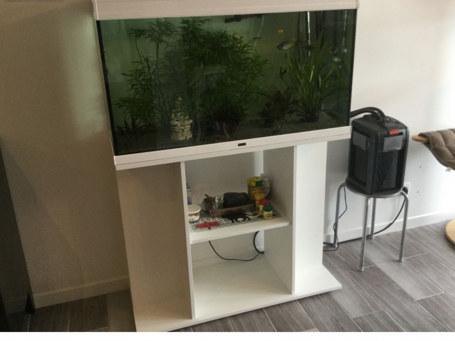 Urgent, Aquarium de marque Aquatlantis excellent état aucune rayures, 1 an en eau, vendu avec sable, pleins de décors, plantes, Meuble en bois blanc. Bulleur Eheim 100 et résistance 200w etc. Pompe externe Eheim professionnel 4+ (8mois).