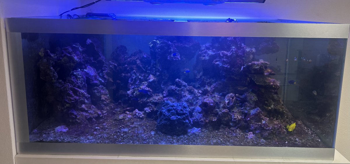 Je vends cet aquarium d'eau de mer de grande taille, parfait pour accueillir une belle variété de poissons tropicaux. - Type de produit : Aquarium - Dimensions : 165cm x 100cm / ht : 70cm - Adapté pour : Poissons tropicaux - Capacité / Volume : 1000 Litres - Accessoires inclus :. Système d'éclairage LED AquaMedic . Pompe de filtration . Filtration externe (Aérobie et Anaérobie) . Pompes de brassage . Décoration . Pierres vivantes . Ecumeur . Petit matériel Actuellement en fonction. A venir chercher sur place. Peut-être remis en fonction immédiatement (déjà chargé en bactéries). N'hésitez pas à me contacter pour plus d'informations ou pour organiser une visite.