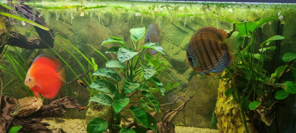 Un couples de discus reproducteurs ainsi que d'autres poissons.
