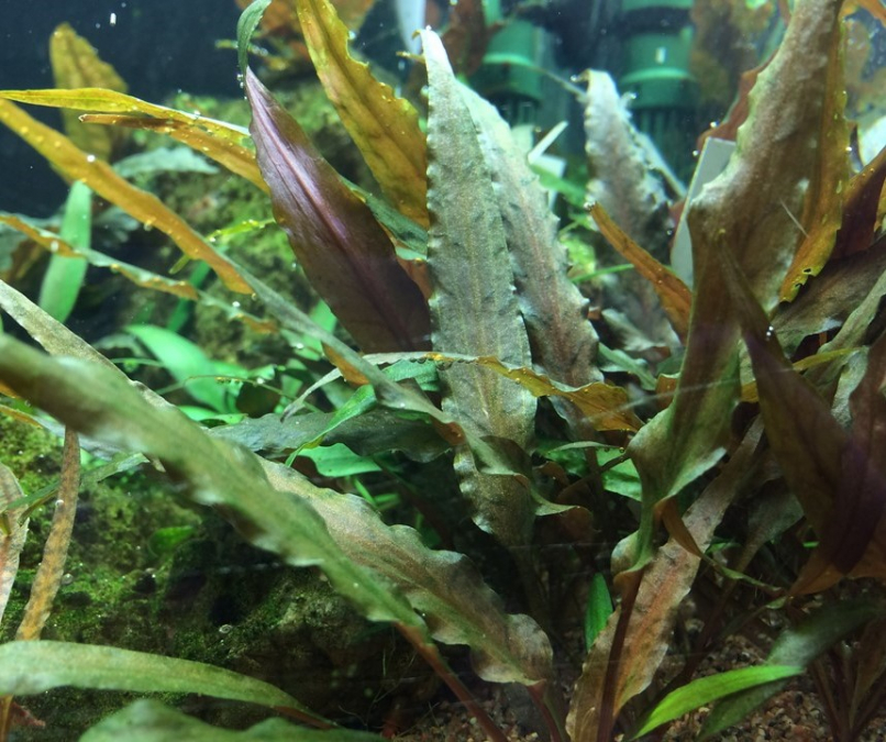La Cryptocoryne undulata, également connue sous son synonyme Cryptocoryne axelrodii, développe des feuilles immergées étroitement lancéolées avec des marges ondulées et une coloration verte à brun foncé, souvent avec un motif marbré foncé. Elle pousse sous une faible lumière et sans engrais, mais mieux sous un éclairage moyen et un substrat riche en nutriments. Comme de nombreuses autres espèces de Cryptocoryne, cette plante se propage facilement par des stolons souterrains.