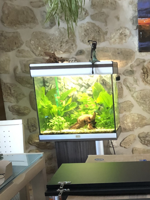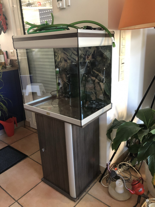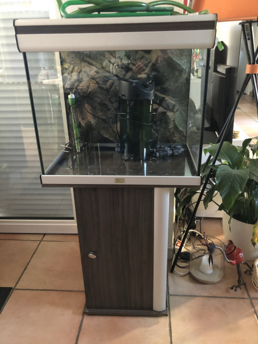 Aquarium design Aquatlantis 90 litres avec son support taupe Bon état général (quelques petites rayures non visibles en eau) Pompe eheim type 2213 Chauffage Askoll