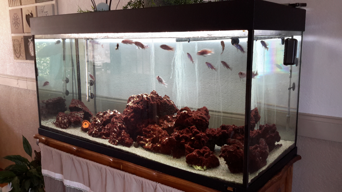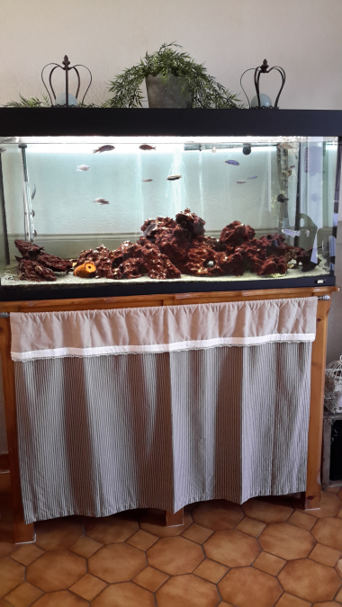 Aquarium de 360 L (120cm*50cm*60cm) avec meuble personnalisé fait par un menuisier (126cm*54cm*92cm). 15 pseudotropheus zébra et 1 melanochromis auratus. Tous ces poissons sont issus de mon élevage. 1 filtre extérieur Tétra EX 800 plus. Arrêt de l'aquariophilie.