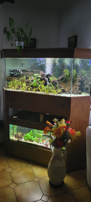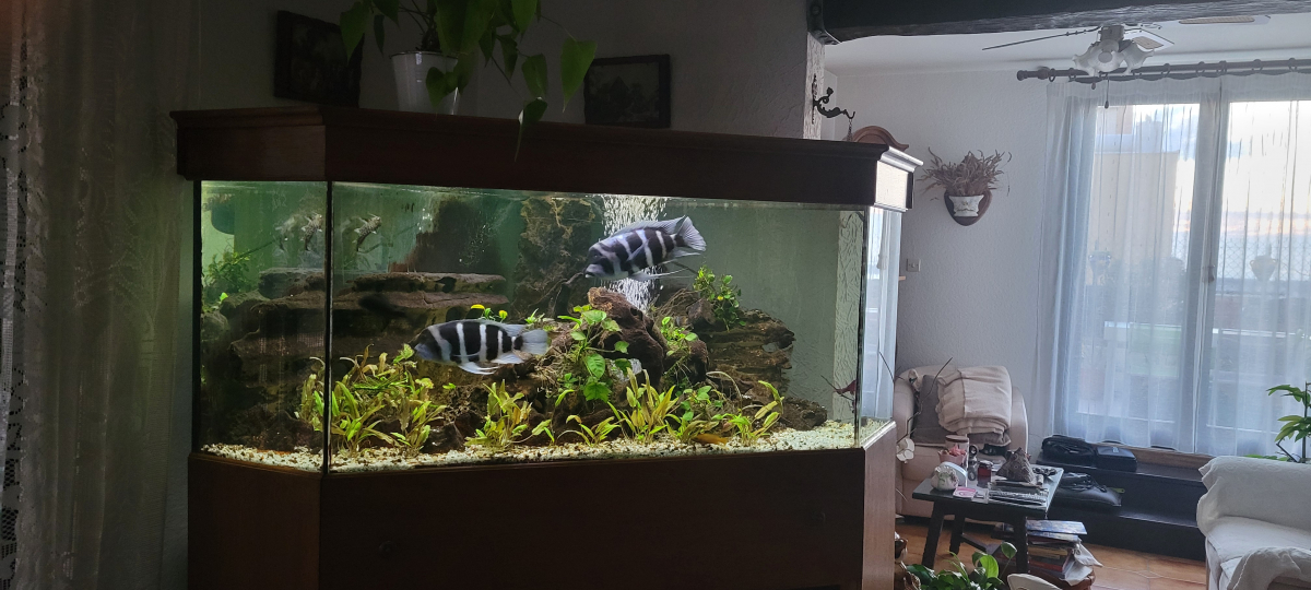 Aquarium d'angle 2 niveaux (450L + 150 L) cotés angles 1 M, vitres avant en 3 faces (pas de rayures) le niveau inférieur sert de second bacs d'environ 100 L plus une filtration interne de 50 L 2 pompes de remontée couvercle à rafraïchir leds artisanales avec modules électronique pour allumage /extinction décalés et progressives meuble structure metallique et habillage bois vendu avec poissons (dont 3 Frontosa) Toujours en eau (photos du jour) à venir prendre à Antibes (06) pourrait servir en eau de mer