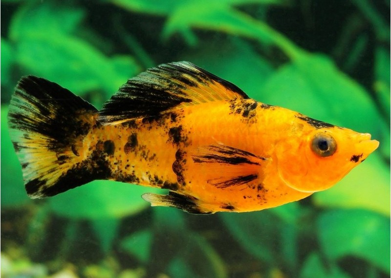 Jeunes mollys bicolores mâles et femelles orange et noir: mère Black Molly noire, père Molly orange vif.