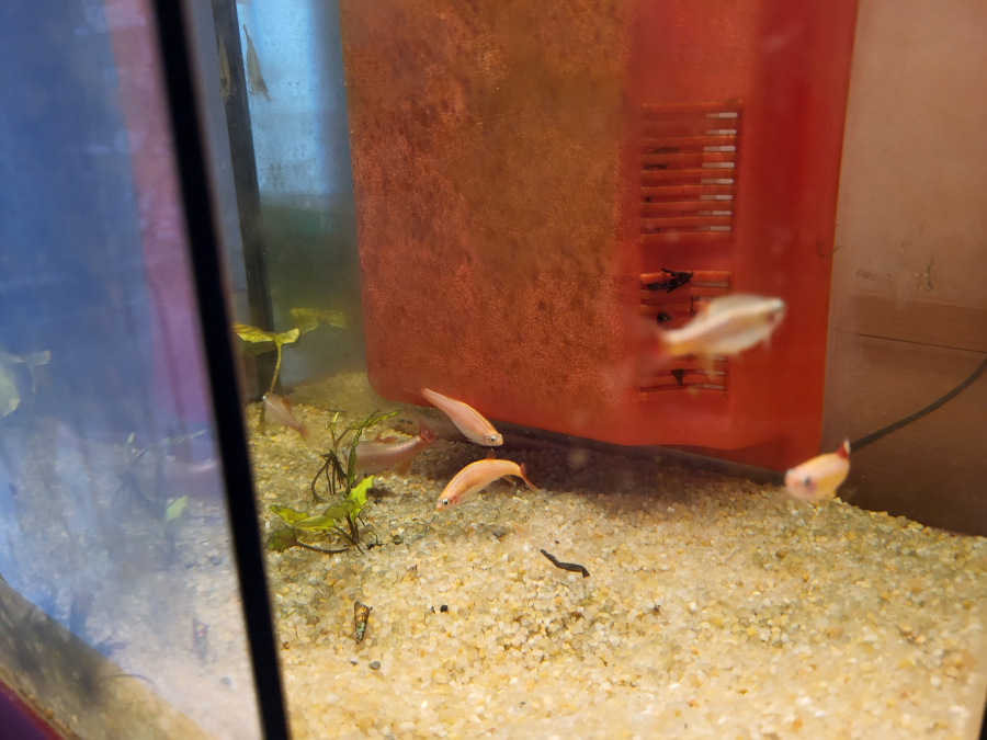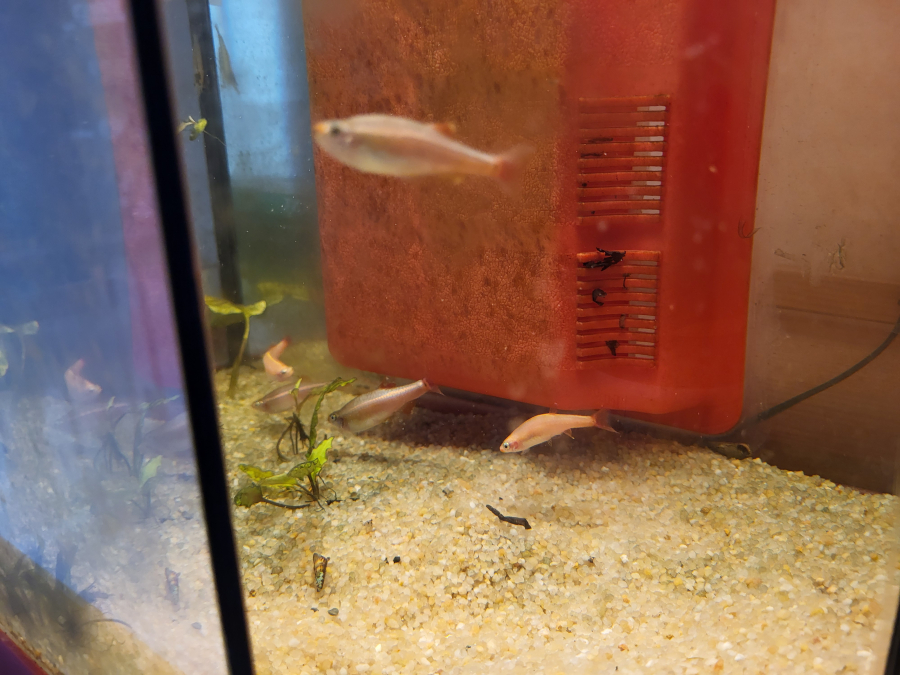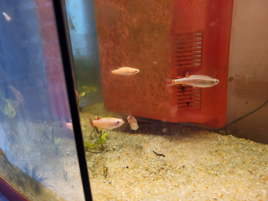 Vends lot de 7 Tanichthys, 4 classiques et 3 albinos (roses) en parfaite santé cause remaniement aquarium. 5€ les 7 poissons