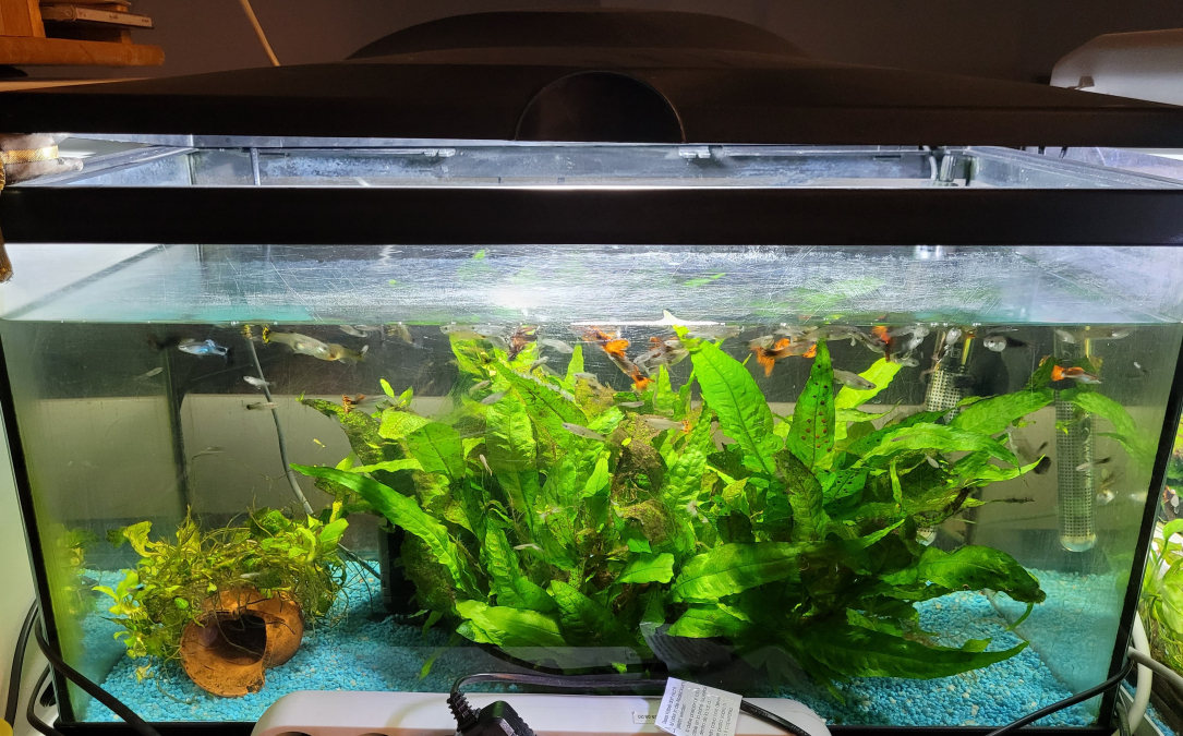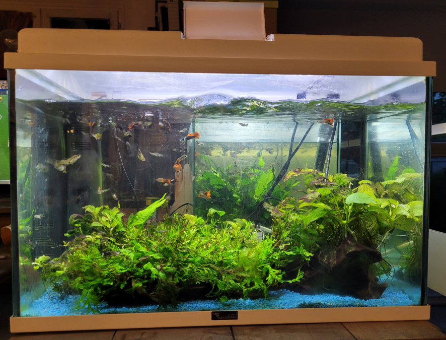 J'aime beaucoup mes guppys mais je n'ai vraiment plus le temps de m'y consacrer pleinement et de les admirer (les bébés qui naissent fréquemment sont vraiment intéressants à voir grandir). Les guppys sont en excellente santé, il y a plusieurs générations. Ils sont plutôt orangés et certains ont des reflets bleutés et d'autres jaunes. Il y a des mâles et des femelles. Les 2 aquariums (avec moteur et thermomètre chauffant) font 40l environ, l'un a une structure et un couvercle blancs et l'autre une structure et un couvercle noirs. Je prends soin de mes guppys depuis plusieurs années et j'y suis attachée ; c'est pour cela que je souhaite les vendre et non les donner, pour être sûre que la personne en prendra aussi bien soin que moi. Je donne également des produits et matériel d'entretien. Comme nous sommes en plein déménagement, les photos ne mettent pas bien en valeur comme ils sont beaux ! Si vous n'êtes pas prêts à consacrer du temps à ces guppys, inutile bien sûr de me contacter.