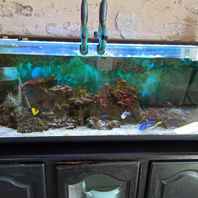 Ensemble du vivant eau de mer avec: 40kg de pierres vivantes Baliste Picasso Chirurgien Hepatus Centropyge bicolore 3 demoiselles Bleues Couple de clown ocellaris