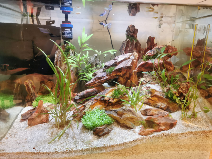 Rempli à la Volvic (ce qui m’a été conseillé sur internet et à la pépinière) et agrémenté d’une flore microbienne instantanée pour y acclimater les poissons dans les heures suivantes (sur conseil du vendeur, mais la prochaine fois je laisserais l’aquarium faire son cycle sans poisson plusieurs semaines, il me semble que c’est mieux pour les poissons)