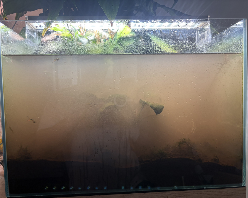 - l'eau s'est troublée une fois que je l'ai eu mis dans son bac (genre laiteux). J'ai donc fait des petits changements réguliers d'eau (genre tous les jours 1L d'eau changé) pour que ça redevienne clair. Ce n'est pas redevenu complètement clair. Je pensais que c'était des nitrates/nitrites qui posaient problème.
