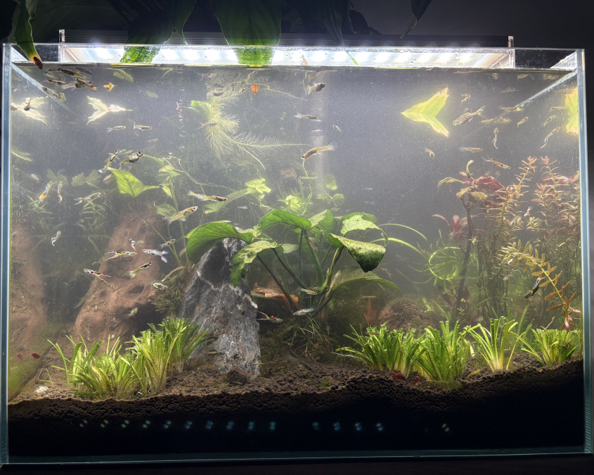 Petits aquariums de 30L, Nano de Dennerle, avec de la lumière. Les bacs sont plantés. l'année passée j'ai eu une hydropisie dans un de mes bacs, le poisson est mort. Alors je l'ai complètement vidé, nettoyé et réaménagé. Après 8 mois de cycle à vide, je me suis dit que j'allais reprendre des poissons. En effet, les petits escargots dans mon bac sont revenus et tout à l'air bien.